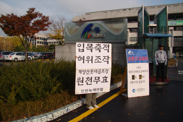 평일 오전 7시부터 9시까지 계양산롯데골프장을 반대하는 인천시민사회단체들이 돌아가며 인천시청 앞 1인시위를 한다. ‘입목축적조사 허위조작, 계양산롯데골프장 원천무효’ 내용으로 1인시위를 벌이는데, 인천녹색연합에서는 월요일마다 맡아 11월 9일, 16일, 23일에 진행했다.