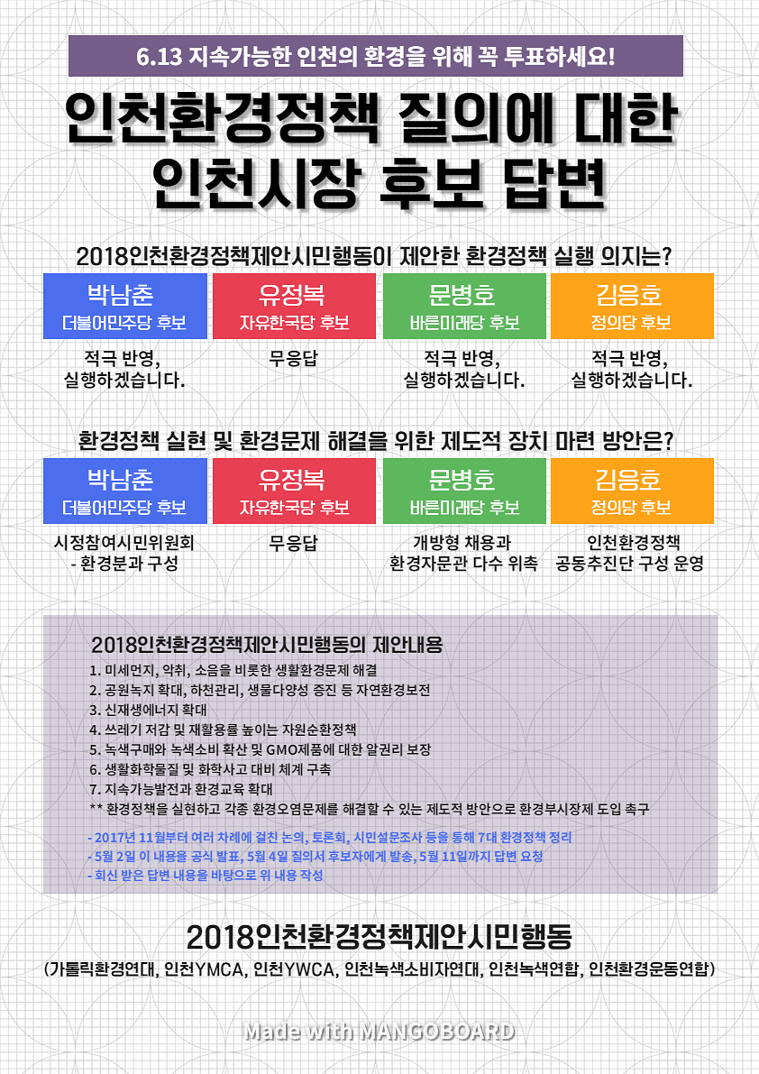 인천지역 단체들이 2017년 11월부터 여러 차례에 걸친 논의, 토론회, 시민설문조사 등을 통해 7대 환경정책을 정리했습니다. 정리한 내용을 5월 2일 공식 발표하고 5월 4일 시장 후보자에게 질의서를 발송해 5월 11일까지 답변을 요청했습니다.