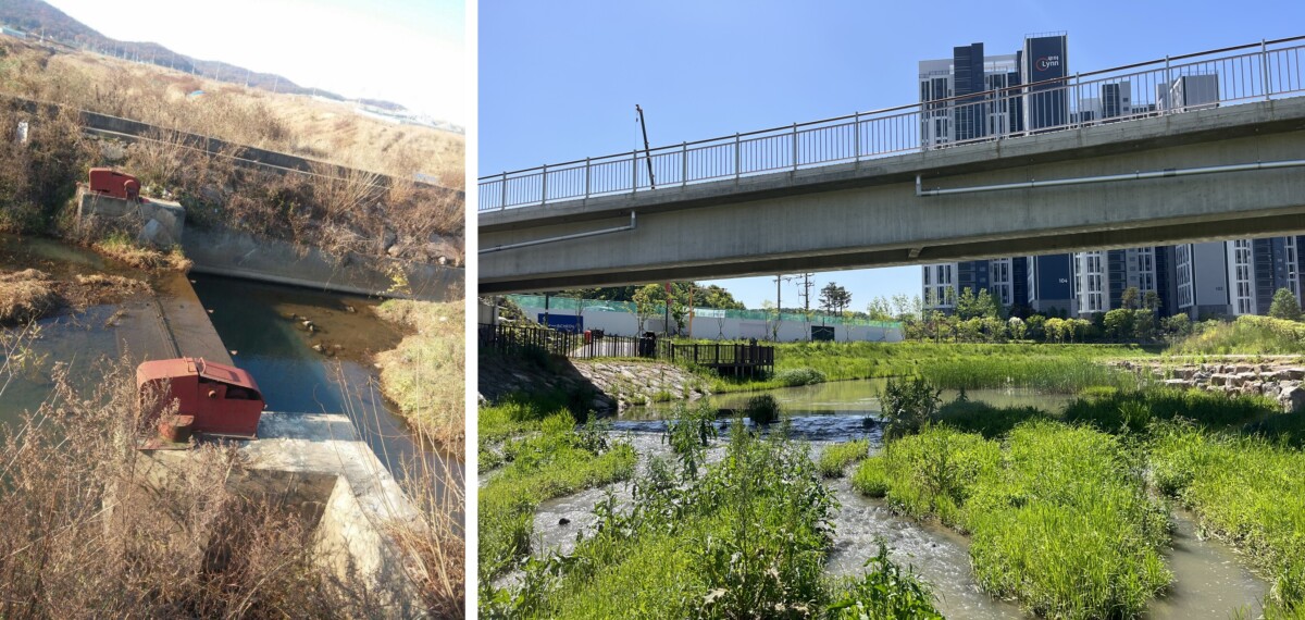 ▽ (좌) 2017년 대포천의 보 모습. 현재는 확인되지 않음. (우) 2024년 상류부 대포천 모습