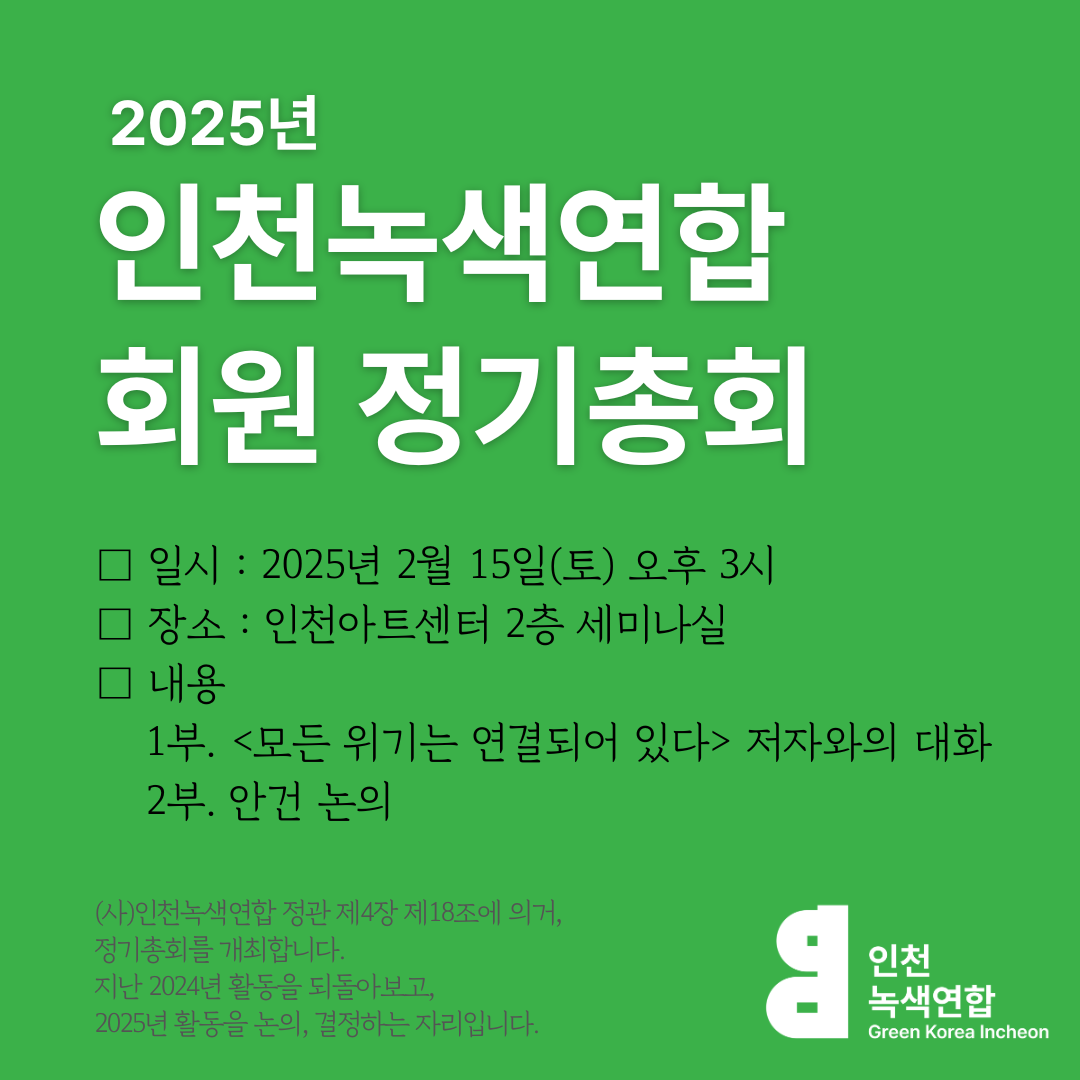 사단법인 인천녹색연합 정관 제4장 제18조 제3항에 따라 아래와 같이 2025년 인천녹색연합 정기총회를 개최합니다.