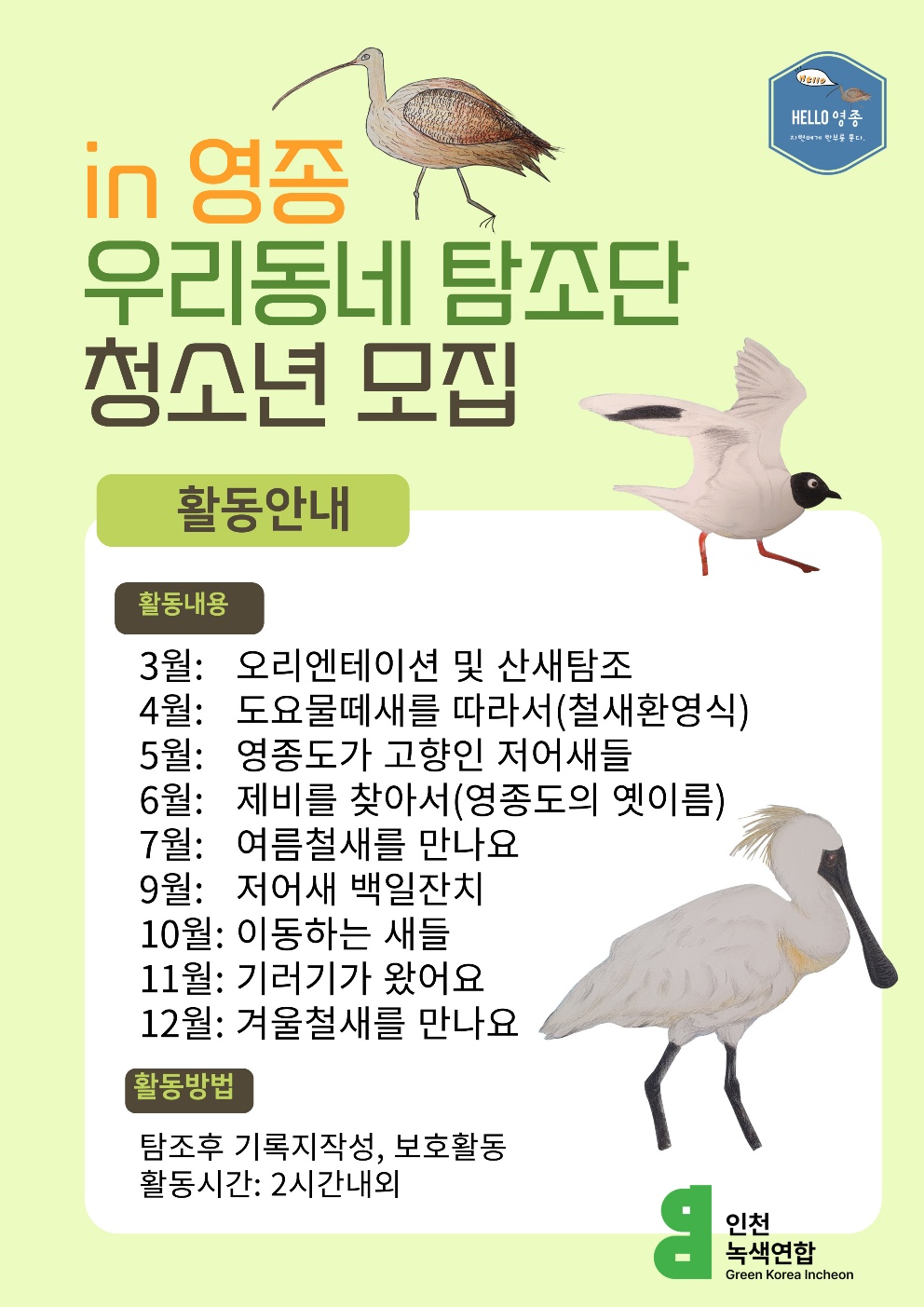 새들이 안내해주는 영종도의 자연환경을 만나고 함께 지켜나가는 활동에 함께해요~- 모집기간 : ~ 3월 5일까지
