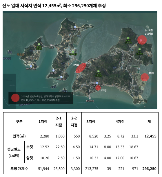 신도 일대 서식지 면적 12,455㎡, 최소 296,250개체 추정했다. 지점별로 보면 3지점인 신도-시도 연결 다리 인근의 서식 면적과 추정 개체수가 가장 많았다.