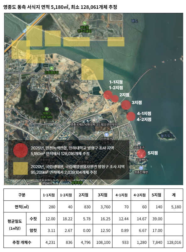 6월, 육안조사를 통해 익히 알려진 영종도 동측, 송산유수지 뿐만 아니라 영종도 서측 해안가 곳곳에서도 확인했으며, 신도의 구체적인 서식 현황을 파악했다. 시도와 무의도에서도 서식 지점을 확인했다. 7월, 이 중 훼손 위협 가능성이 높다고 판단한 영종도 동측과 신도 일대에서 방형구 조사를 실시해 구체적인 서식 면적, 밀도, 개체수를 산정했다.