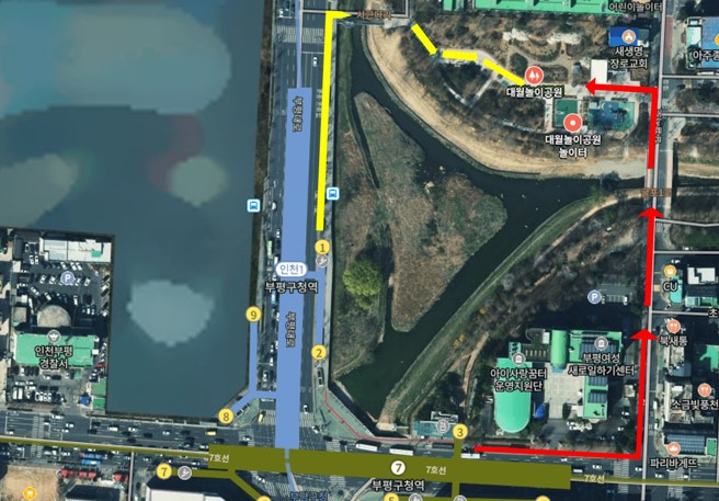 - 부평구청역 (인천1호선) 1번 출구로 나와 직진 -> 사근다리 건너 대월놀이공원으로 진입 -> 대월놀이공원 놀이터 쪽으로 이동.
