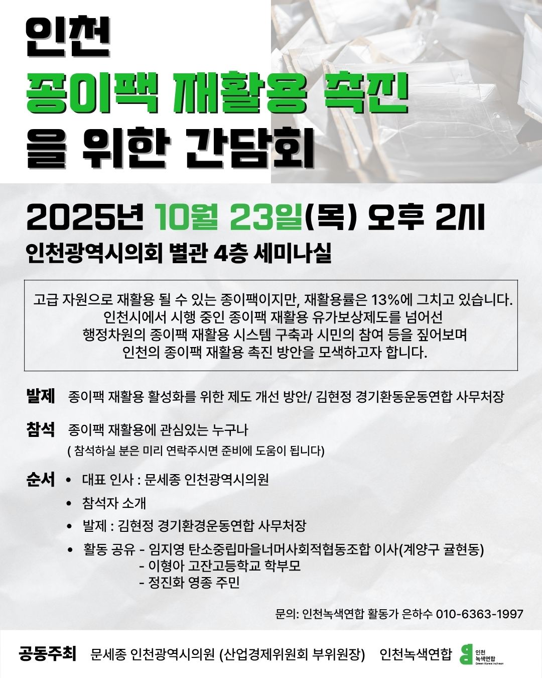 ⭐공동주최 : 문세종 인천광역시의원(산업경제위원회 부위원장), 인천녹색연합
