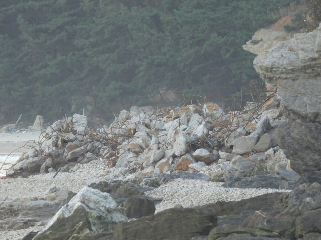 -철거된 시멘트 옹벽 폐기물 방치, 차단펜스 설치되어 있지 않아 해양오염 우려