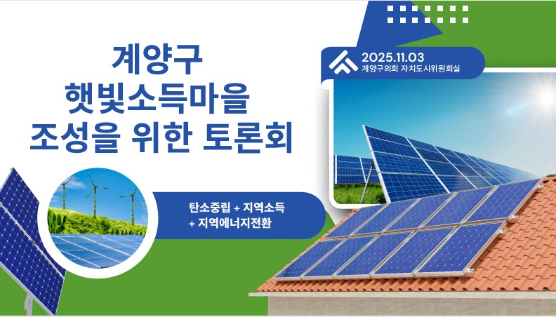 11월 13일(목) 오후 2시, 계양구의회 5층 자치도시위원회 회의실에서 ‘’탄소중립, 재생에너지 전환, 지역소득 계양구 햇빛소득마을조성을 위한 토론회”가 진행되었다. 인천녹색연합, 계양구의회, 탄소중립마을너머 사회적협동조합이 공동주최한 이번 토론회는 국가와 인천광역시의 탄소중립을 위해서 구단위에서 주민들이 주도하는 시민참여햇빛발전을 추진하기 위해서 필요한 과제와 민관협력사항을 논의하고자 마련되었다.