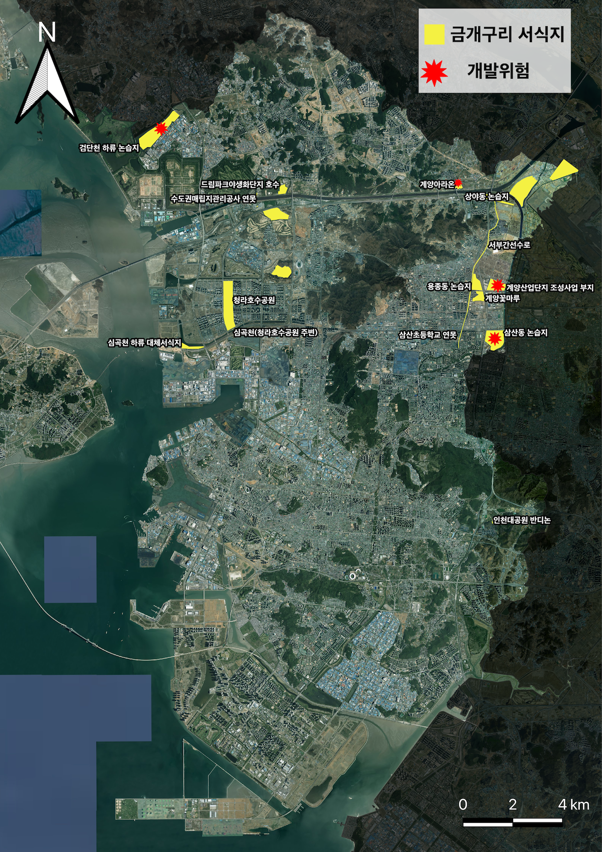 특히 ‘삼산4지구 도시개발사업’ 부지에서는 다수의 금개구리가 서식하는 것이 확인되었으며, 이 지역은 금개구리 서식이 확인된 논습지 전체 면적의 16%를 차지한다. 그러나 인천시는 지난 10월 ‘삼산4지구 도시개발사업 전략환경영향평가 항목 등의 결정’을 공개하며 개발을 위한 행정절차를 추진할 계획을 밝혀 서식지 보전에 빨간불이 켜졌다.
