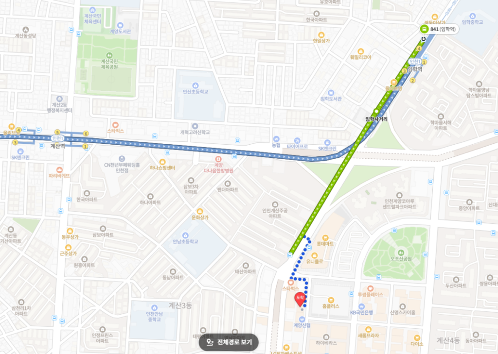 혹은 임학역 4번출구 정류장에서 841번 버스 탑승 > 롯데마트계양점(고용복지센터) 하차