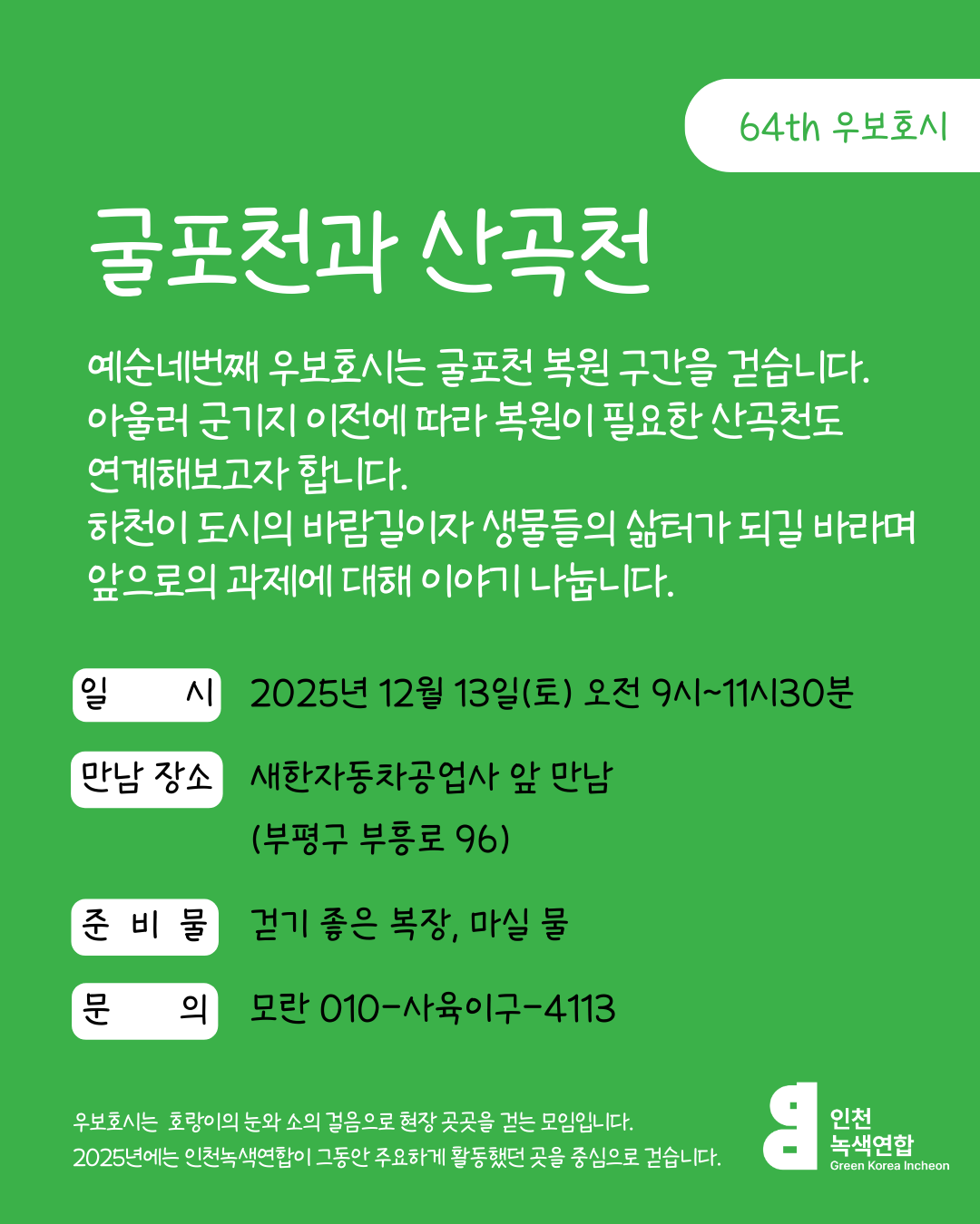 예순네번째 우보호시는 굴포천 복원 구간을 걷습니다. 아울러 군기지 이전에 따라 복원이 필요한 산곡천도 연계해보고자 합니다. 하천이 도시의 바람길이자 생물들의 삶터가 되길 바라며 관련 이야기를 나눕니다.