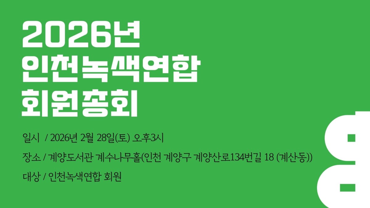 (사)인천녹색연합 정관 제18조 제3항에 따라 2026년 정기 총회를 개최합니다.
