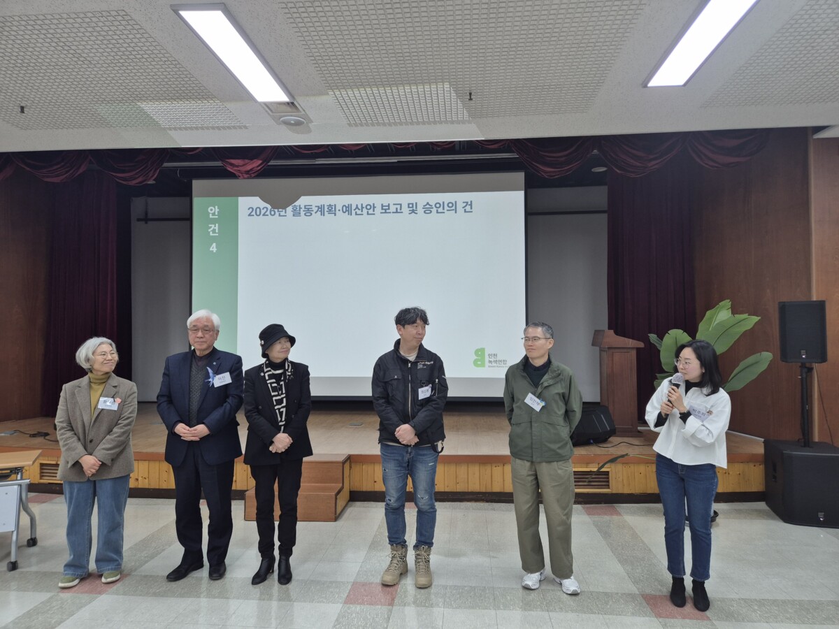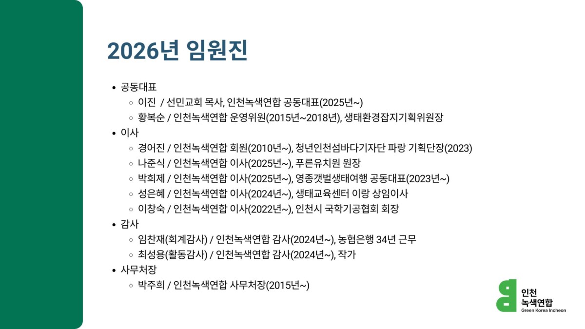 그동안 인천녹색합과 함께하신 문태석 상임대표, 김경숙 공동대표님과 송규운 이사님은 그동안 활동에 감사드리고 회원으로 더 많은 활동을 이어가시기로 하였습니다. 임원추천위원회를 구성하여 사무처와의 유기적인 관계 등을 고려하고 문제가 없다면, 가능한 기존 임원의 연임을 독려하고 이사의 경우 미래세대 의견을 반영하고 키우는 의미에서 청년 혹은 청소년 이사선임으로 확장하기로 하였습니다. 그래서 2026년에는 새롭게 황복순 공동대표와 경어진 이사를 모시고 총회에서 위임을 받아 이사회에서 대표자를 보강하기로 하였습니다.