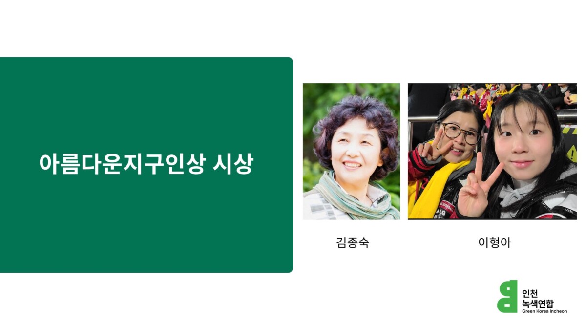 평생길동무는 10년동안 인천녹색연합의 활동을 정기후원으로 응원과 지지를 이어주시는 회원분들이며 그 분들이 계셨기에 지금의 인천녹색연합이 꿋꿋이 활동할 수 있었습니다. 아름다운지구인상은 만3년 이상 꾸준히 초록교사로 자원활동으로 함께한 김종숙회원님과 초록세상을 위한 녹색씨앗을 널피 퍼트리는데 열정을 다해주셔서 정기후원자를 많이 초대하신 이형아 회원님에게 드렸습니다. 푸른나무상은 초록동무, 게눈, 또랑의 다양한 교육활동에 성실하게 참여한 미래세대 어린이, 청소년들에게 주는 상이며 올해 수상자는 이희원, 강형재, 손정우 회원입니다. 상을 받으신 회원뿐 아니라 자신의 일상과 다양한 활동참여로 녹색세상을 함께 만들어 주신 모든 회원 모두에게 감사드립니다.