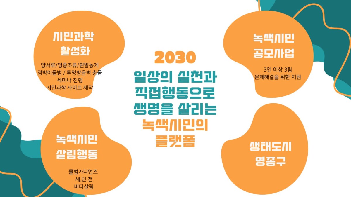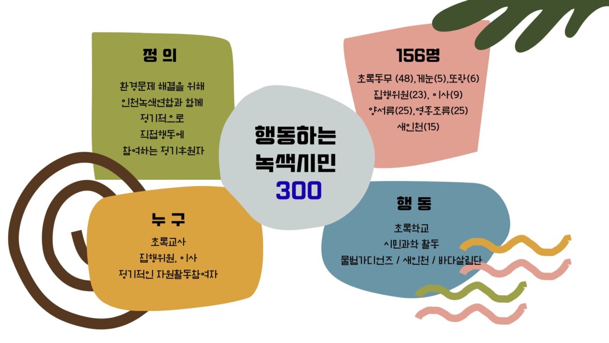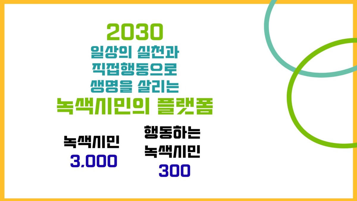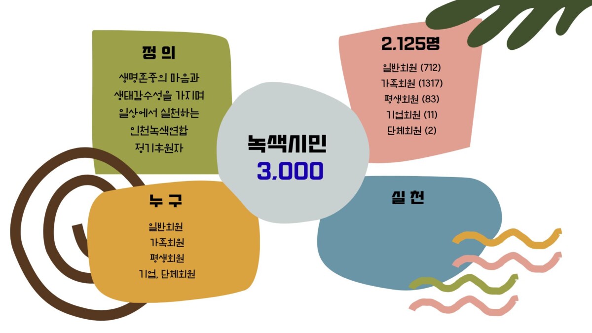 “2030 녹색시민 플랫폼” 녹색시민 3,000, 행동하는 녹색시민 300 녹색시민 : 생명존중의 마음과 생태감수성을 가지며 일상에서 실천하는 인천녹색연합 회원 |