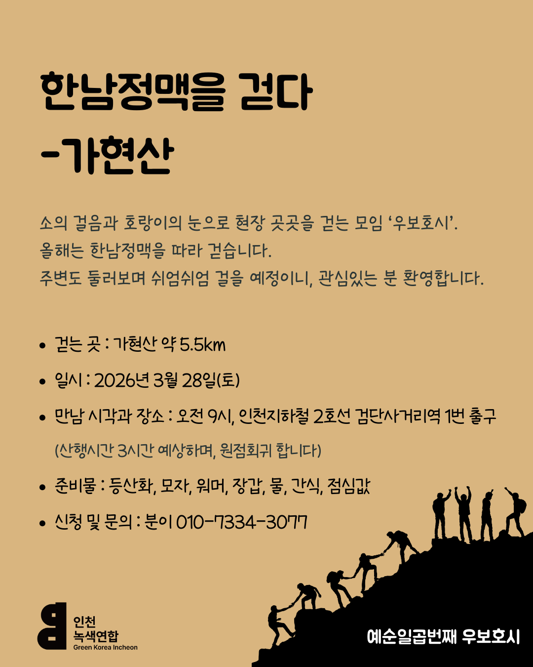 - 만남 시각과 장소 : 오전 9시, 인천지하철 2호선 검단사거리역 1번 출구(산행시간 3시간 예상하며, 원점회귀 합니다)